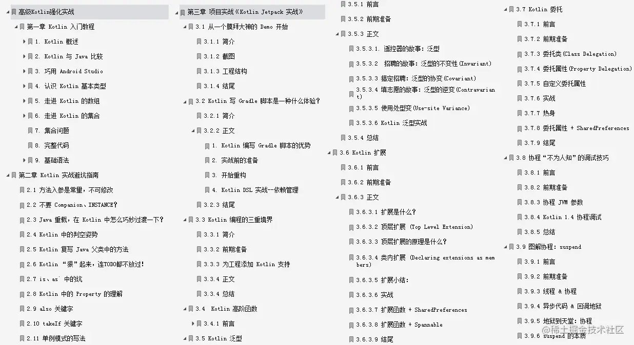 掌握了lambda表达式,就等于战士有了枪,多练习,多思考,才能掌握lambda表达式的精髓,也能为掌握函数式编程,打下坚实的基础。 关于Kotlin究竟是如何提高开发效率的,和它的类委托在这里就不详说了,详细内容可见下面文档 ####Kotlin基础入门到高级强化实战资料分享: 今天分享的一共分为两部分:字节跳动厂内部超高质量Kotlin笔记、谷歌大佬编写高级Kotlin强化实战(附Demo)。