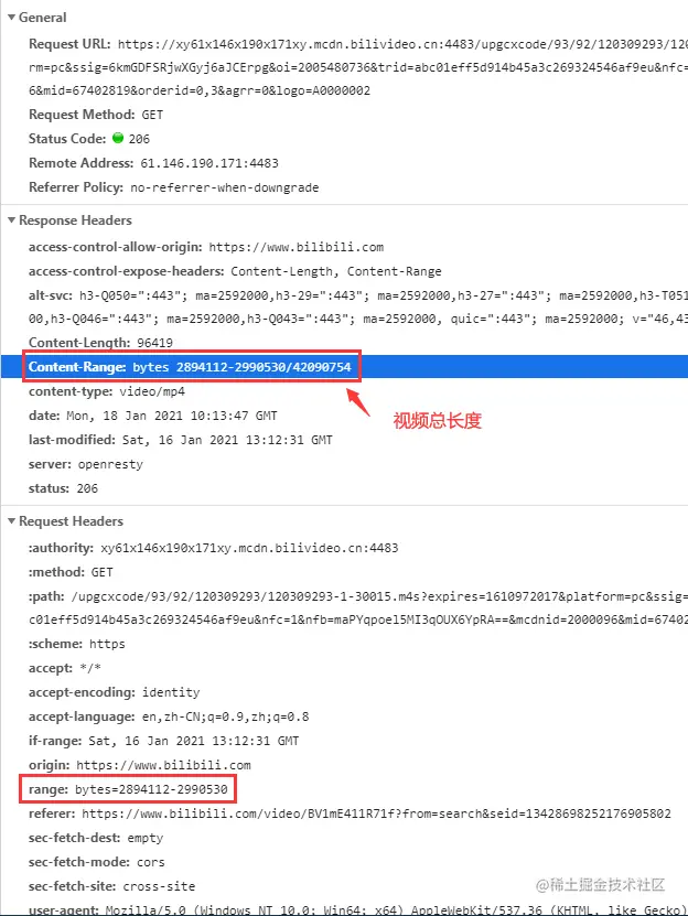 em?请求头中的 range 字段指定了视频段的范围,响应头中的 Content-Range 字段可以拿到总的视频总长度。