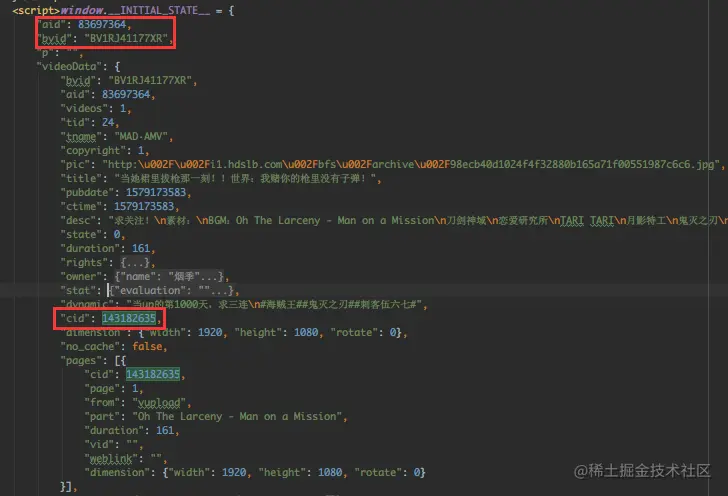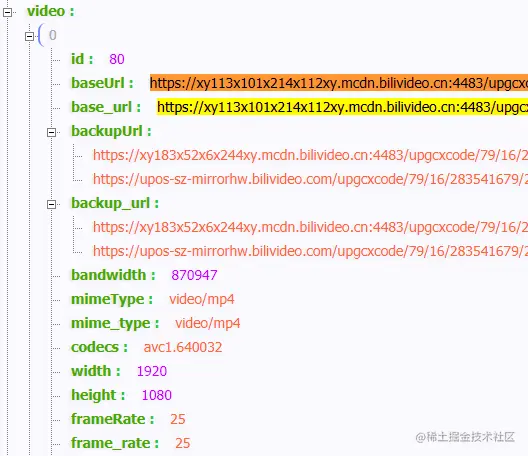 值一样却有两种命名方式的字段,估计是新旧接口兼容,video 下这样的数据有好几个,对应不同清晰度的视频。