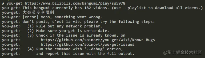 接着有些视频(如新番),需要大会员才能观看下载,直接下载会报错: