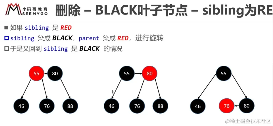- 3、兄弟是红色。则如下图。 让兄弟节点的儿子成为自己的兄弟节点。 然后在删除