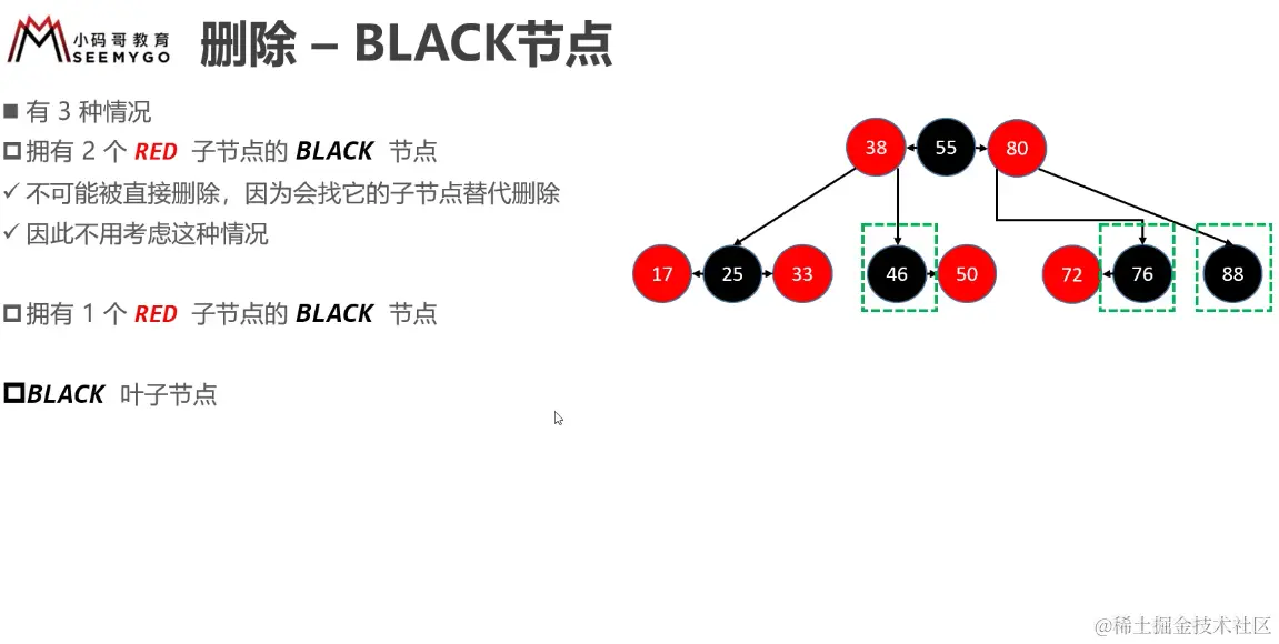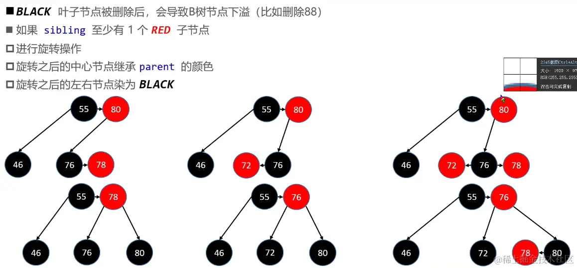 - 其中四种是删除红色节点, 红色节点的删除对原二叉树性质没有影响,所以直接删除