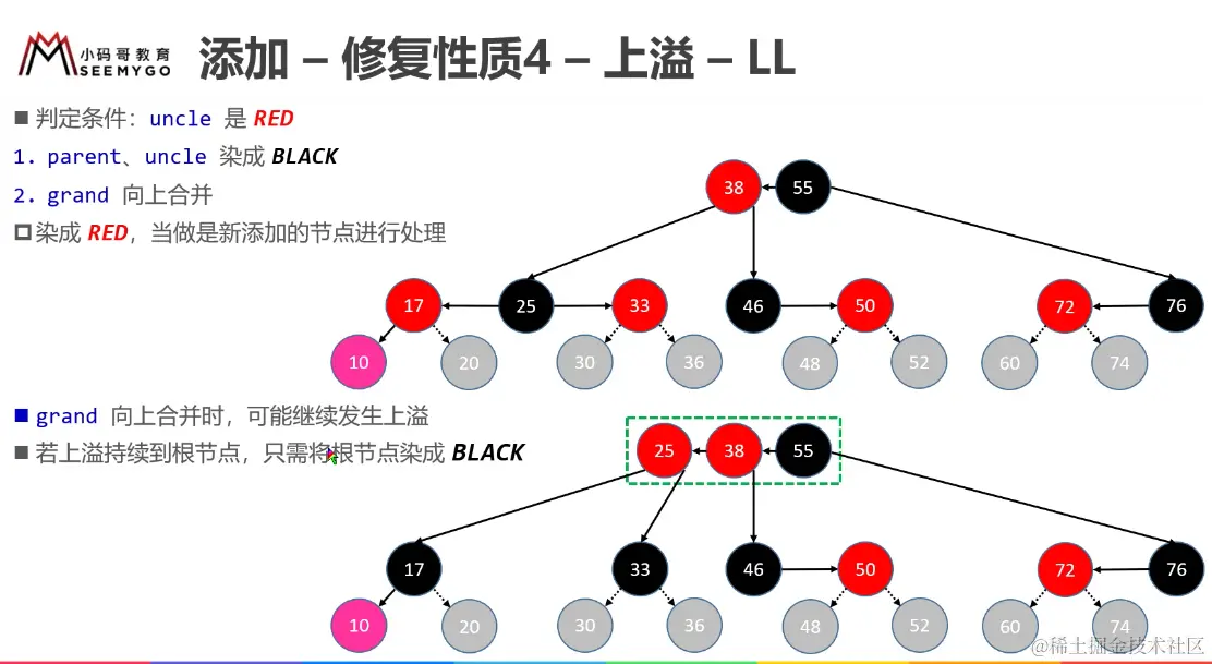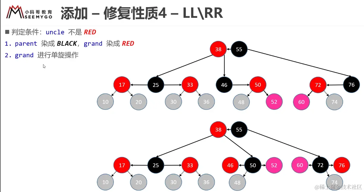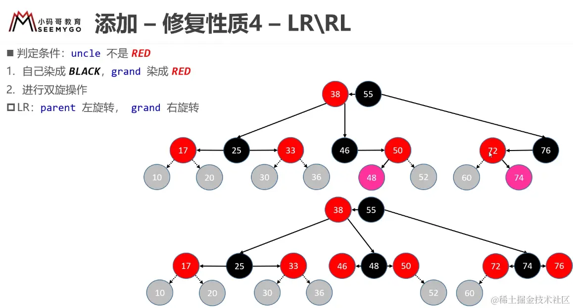 LR\RL 如上图如果加的是48 和 74 。 则染色是一直的。 只不过是需要旋转两次。 和AVL一样。
