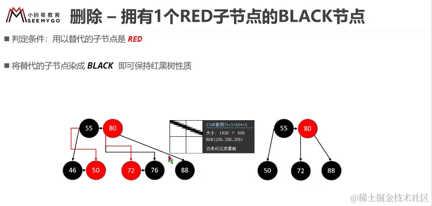 - 46 和 76 的判断条件是 替代他的节点是红色。 删除他们也很简单, 就是帮他删除然后替代他的染成黑色。 入下图2.。