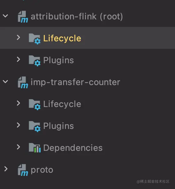 这里attribution-flink是一个root模块,然后下面有两个模块,一个是imp-transfer-counter,另一个是proto,然后多个模块之间会有相互依赖的关系,比如这里imp-transfer-counter依赖proto模块,现在想要把imp-transfer-counter模块打包,要注意以下的坑
