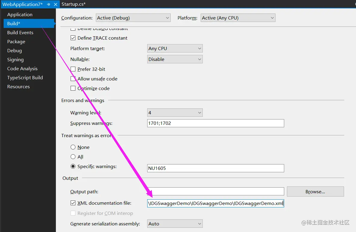 值得注意的是: Swagger 默认并不会显示 XML 注解,需要手工打开它,那怎么做呢?右键 Project,选择 Properties 后切换到 Build 页面,然后选中 XML documentation file 项 并且指定好 xml 生成的位置,参考如下: