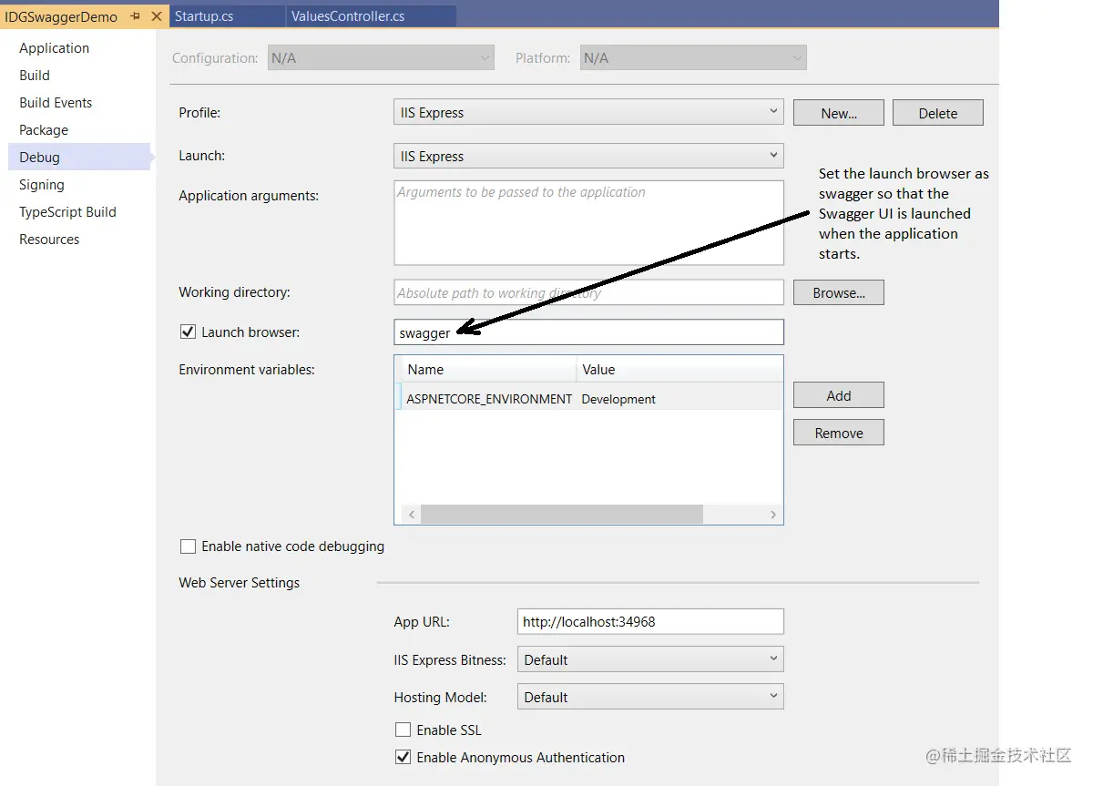 要想将启动项目的url指到 SwaggerUI,右键 Project 并选择 Properties,在 Debug 的 Lanuch browser 上指定 swagger 即可,如下图所示: