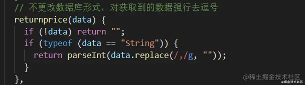 打断点可以看出最后得到的数据是一个去逗号的字符串,而数据库需要的是一个没有逗号的数字,所以此处对收到的数据做了条件判断。1、没有输入数据时传给数据库为空。 2、如果数据类型为字符串时,返回一个去逗号然后进行 parseInt() 将字符串转换成数字。