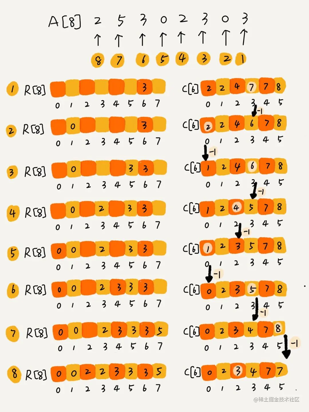 数组R[8] = [0,0,2,2,3,3,3,5]存储考生名次。那么如何得到R[8]的呢? 从后到前依次扫描数组A,比如扫描到3时,可以从数组C中取出下标为3的值7,也就是说,到目前为止,包括自己在内,分数小于等于3的考生有7个,也就是说3是数组R的第7个元素(也就是数组R中下标为6的位置)。当3放入数组R后,小于等于3的元素就剩下6个了,相应的C[3]要减1变成6。 以此类推,当扫描到第二个分数为3的考生时,就会把它放入数组R中第6个元素的位置(也就是下标为5的位置)。当扫描完数组A后,数组R内的数据就是按照分数从小到大排列的了。(这么做是为了保证稳定排序)
