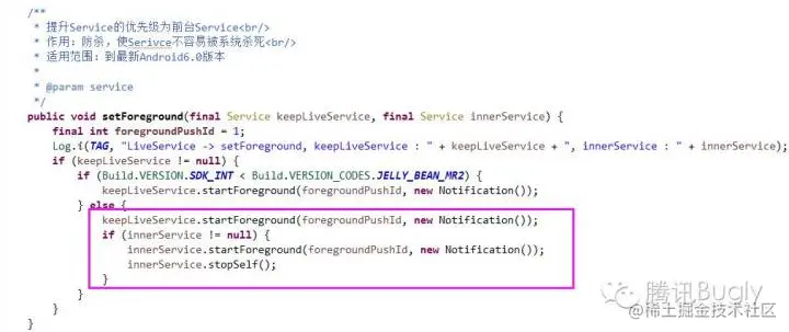 Android 中 Service 的优先级为4,通过 setForeground 接口可以将后台 Service 设置为前台 Service,使进程的优先级由4提升为2,从而使进程的优先级仅仅低于用户当前正在交互的进程,与可见进程优先级一致,使进程被杀死的概率大大降低。