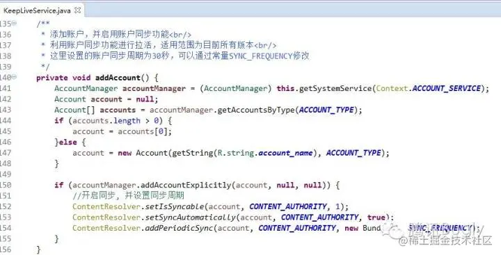 Android 系统的账号同步机制会定期同步账号进行,该方案目的在于利用同步机制进行进程的拉活。添加账号和设置同步周期的代码如下: