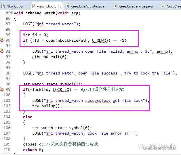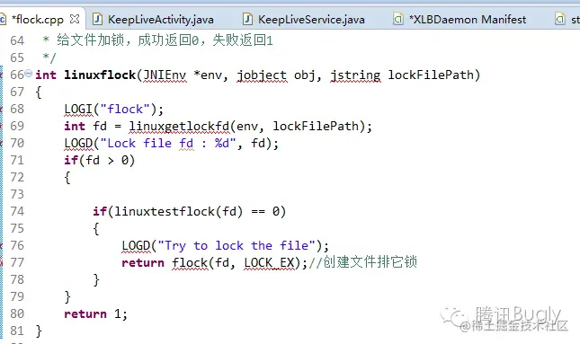 在主进程中创建一个监控文件,并且在主进程中持有文件锁。在拉活进程启动后申请文件锁将会被堵塞,一旦可以成功获取到锁,说明主进程挂掉,即可进行拉活。由于 Android 中的应用都运行于虚拟机之上,Java 层的文件锁与 Linux 层的文件锁是不同的,要实现该功能需要封装 Linux 层的文件锁供上层调用。
