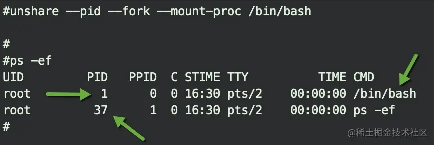 通过unshare命令,可以快速建立一些隔离的例子,我们拿最简单直观的pid namespace来看一下它的效果。