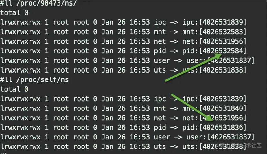 接下来,在宿主机上,把sleep对应进程的命名空间信息,和宿主机的命名空间信息作一下对比。可以看到,它们的pid namespace,对应的数值是不同的。