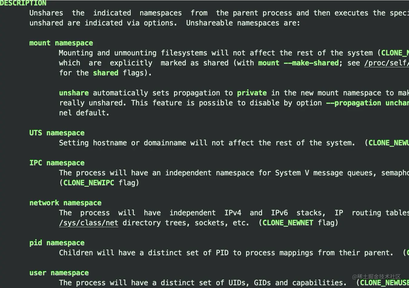 我们先来看一下,Linux都支持哪些Namespace。可以通过unshare命令来观察到这些细节。在终端执行man unshare,将会出现这些Namespace的介绍。