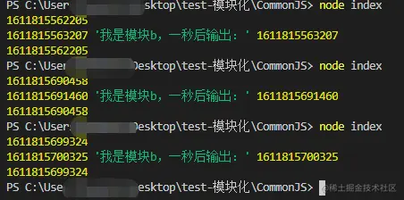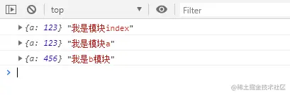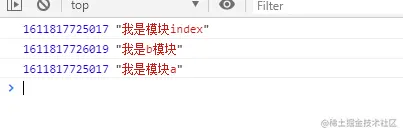 上面这个示例,输出了三行内容,第一行是index.js输出的,第二行是b.js模块输出,最后一行是由a.js模块输出,第一行内容和第三行内容相同,第二行的内容不同。