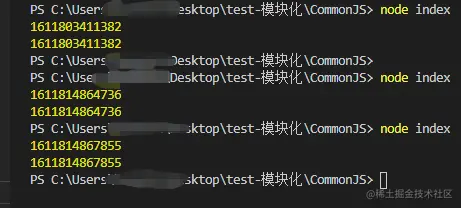 将示例二中的代码执行node index.js命令, 查看输出结果,可以发现,得到的两行输出结果都是相同的,而且无论执行多少次二者都相同。