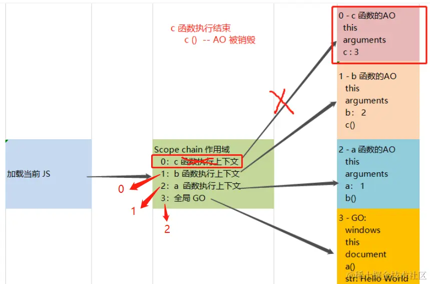 b.[[scope]] 不存在 --- c 的 GO 销毁,没有 b-AO 这一层的关联,直接与 GO 断开了链接