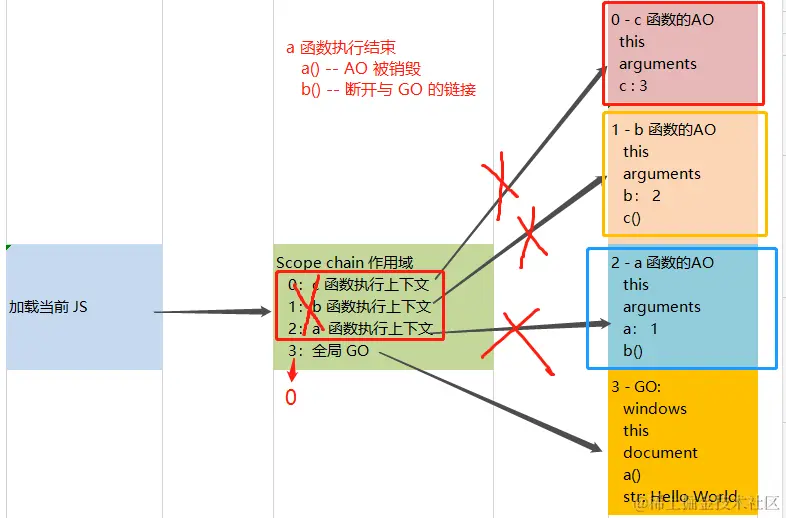 a.[[scope]] 不存在 --- b 的 GO 销毁, 没有 a-AO 这一层的关联,直接与 GO 断开了链接