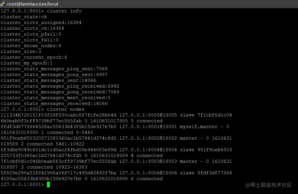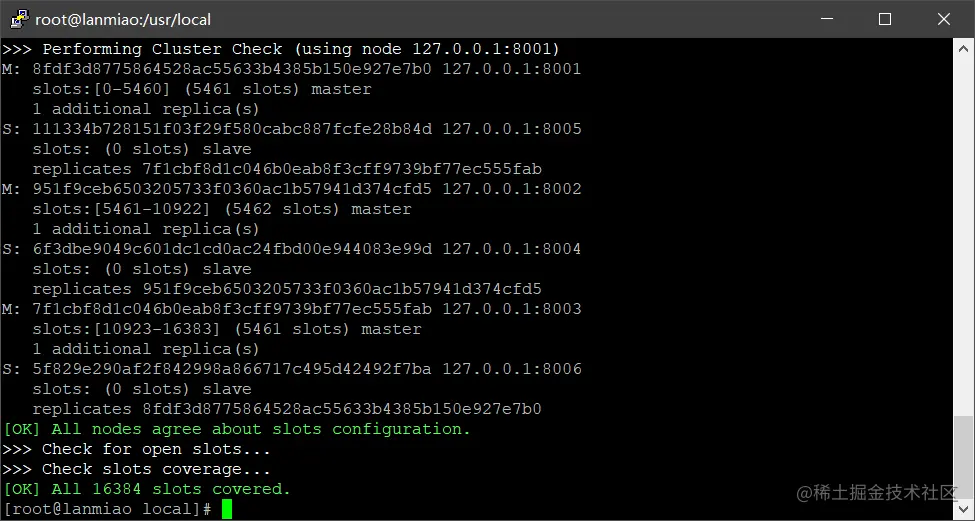 redis-cli --cluster create --cluster-replicas 1 127.0.0.1:8001 127.0.0.1:8002 127.0.0.1:8003 127.0.0.1:8004 127.0.0.1:8005 127.0.0.1:8006