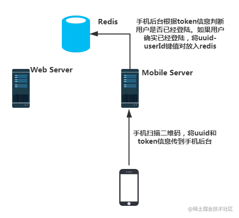用户请求到二维码后,就开始拿出手机,打开相应的App扫描二维码。扫描过程中手机会将uuid和手机端登陆后获得的token信息一起提交到手机端服务器。