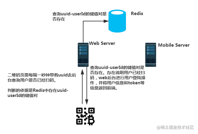 - 移动端扫码之后,会得到验证信息和uuid。因为移动端是已经登录过的,所以,本地有当前的用户信息(token、userId等),移动端将需要带上用户信息和校验信息,向服务端发送登录请求。