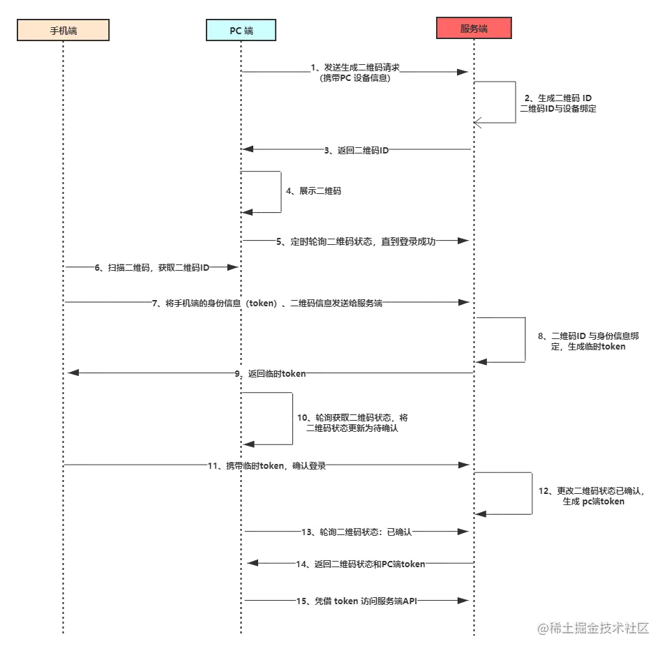 扫码登录,可以分为移动端与服务端的交互 和PC端与服务端的交互两个过程。