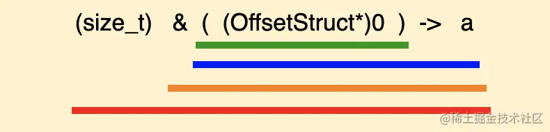 现在我们把 0 这个地址里的数据看成是一个 OffsetStruct 结构体变量(通过强制转换来告诉编译器),这样就得到了一个 OffsetStruct 结构体指针(下图中绿色横线),然后得到该指针变量中的成员变量 a(蓝色横线),再然后通过取地址符 & 得到 a 的地址(橙色横线),最后把这个地址强转成 size_t 类型(红色横线)。