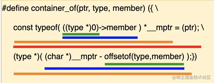 - 橙色横线:利用 typeof 关键字,获取该 member 的类型,然后定义这个类型的一个指针变量 __mptr;