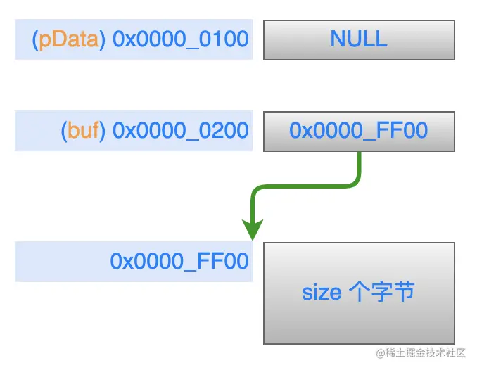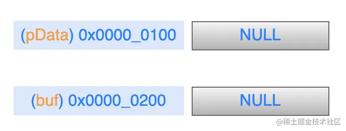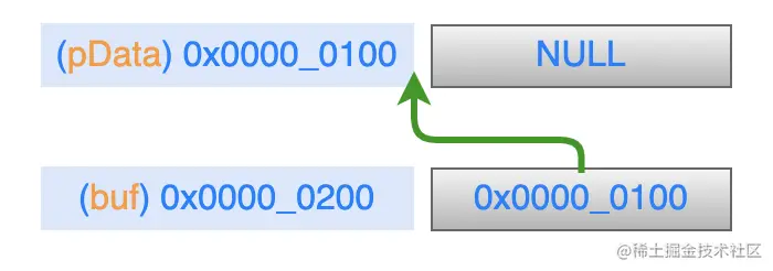 在被调用函数中执行 malloc 语句之后,从堆区申请得到的地址空间赋值给 buf,就是说它就指向了这个新的地址空间,而 pData 里仍然是NULL,内存模型如下: