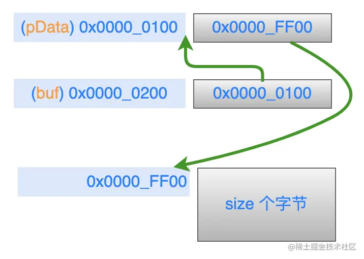刚进入被调用函数 demo2_malloc_heap_error 的时候,形参 buf 是一个 char* 型的二级指针,就是说 buf 里的值是另一个指针变量的地址,在这个示例中 buf 里的值就是 pData 这个指针变量的地址,内存模型如下: