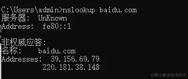 输入cmd弹出DOS窗口,输入nslookup 域名(baidu.com)查看IP