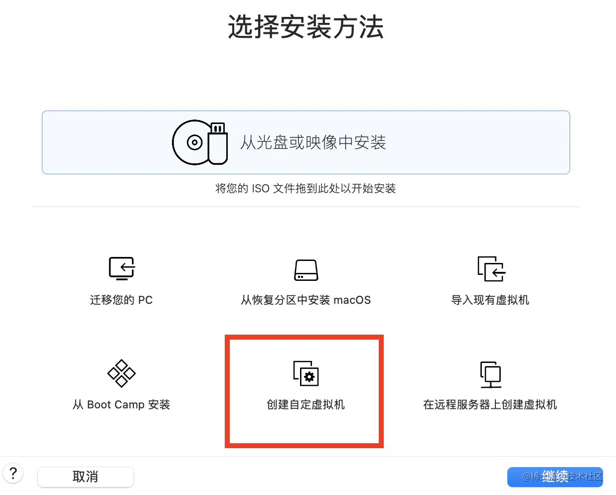 点击安装好的VMware Fusion,选择文件下面的新建,出现下图,点击创建自定虚拟机,这一步需要我们把下载好的Ubuntu iso 直接拖到指定位置即可: