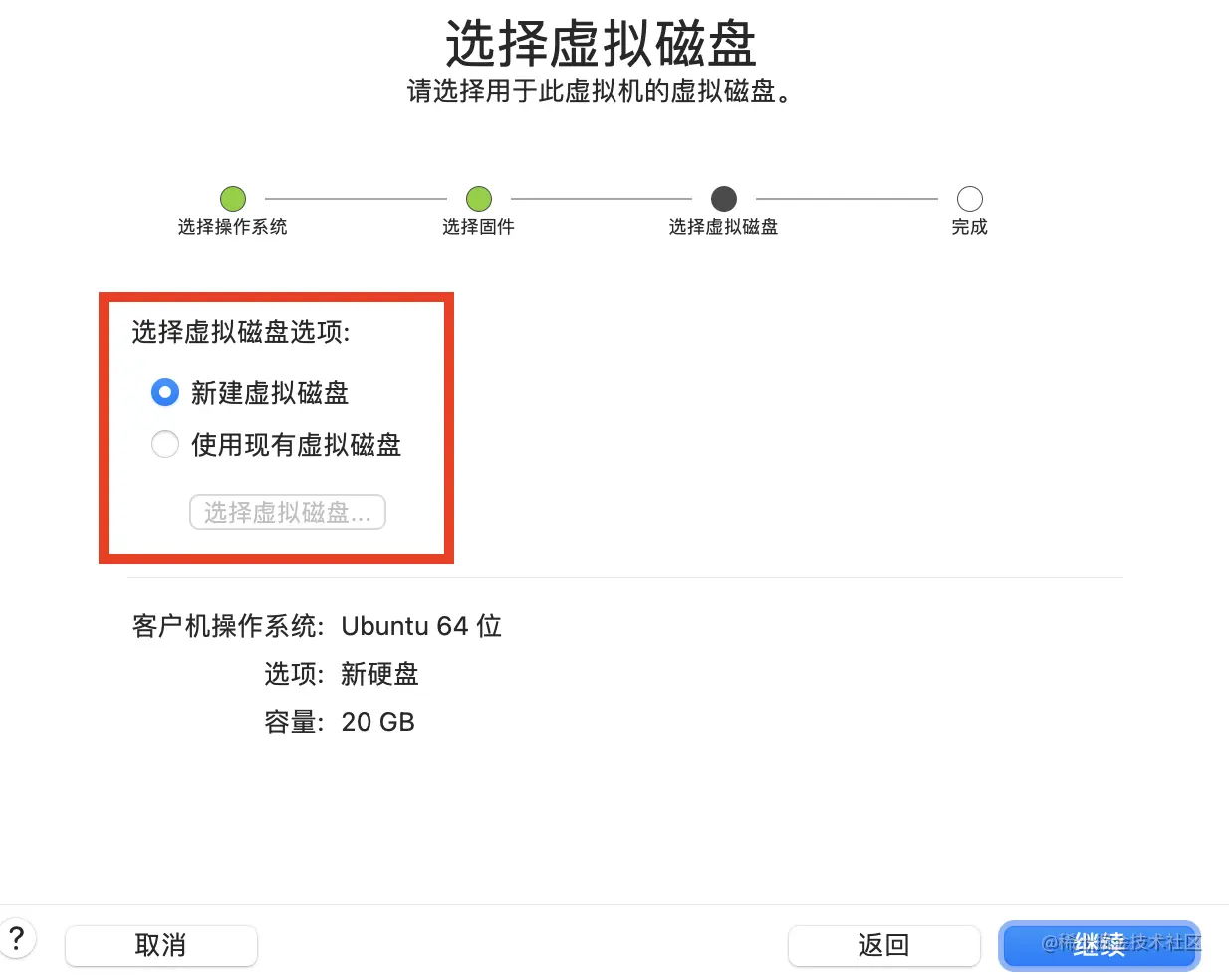 选择虚拟磁盘选项,默认选择新建虚拟磁盘,点击继续: