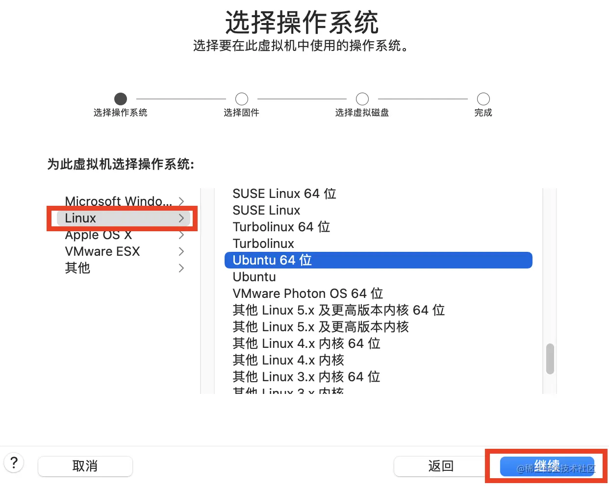 右侧选择Linux,左侧选择Ubuntu 64位,点击继续: