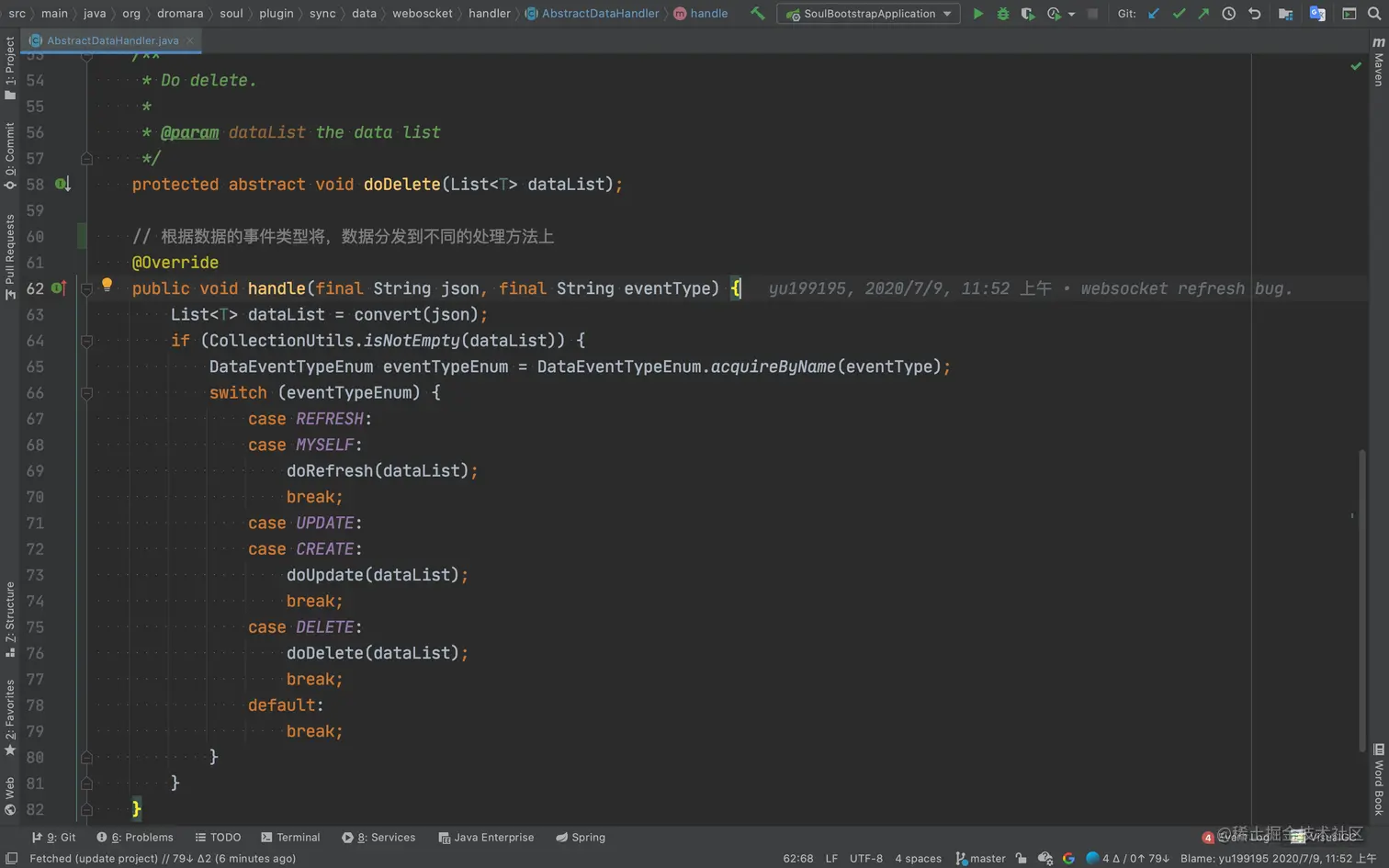 实现 Websocket 通信的入口类 SoulWebsocketClient 在接到admin通信后, 调用 WebsocketDataHandler 的 executor() 方法匹配信息类型, 并调用对应的 DataHandler 的 handler() 去处理信息.