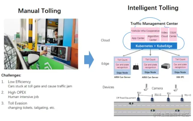 目前,KubeEdge 已被广泛应用于交通、能源、互联网、CDN、工业制造、智慧园区等行业。在中国的省界高速公路电子收费系统(ETC)中,KubeEdge 帮助管理了全国 34 个省、市、自治区中的 29 个总计约 100,000 个边缘节点和 500,000 多个边缘应用程序。借助这些应用,该系统每天处理 超过 3 亿条数据,将收费站的交通效率提高了 10 倍。