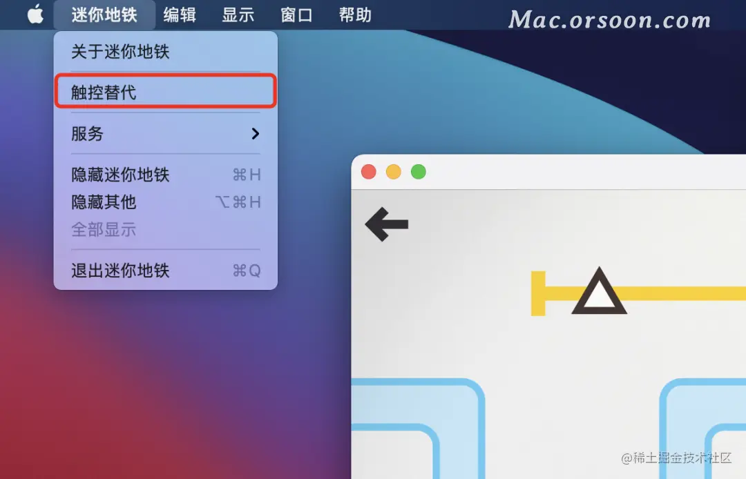 打开 iOS 应用后,点击桌面顶部的菜单栏,可以发现,多了一个「触控替代」的选项。