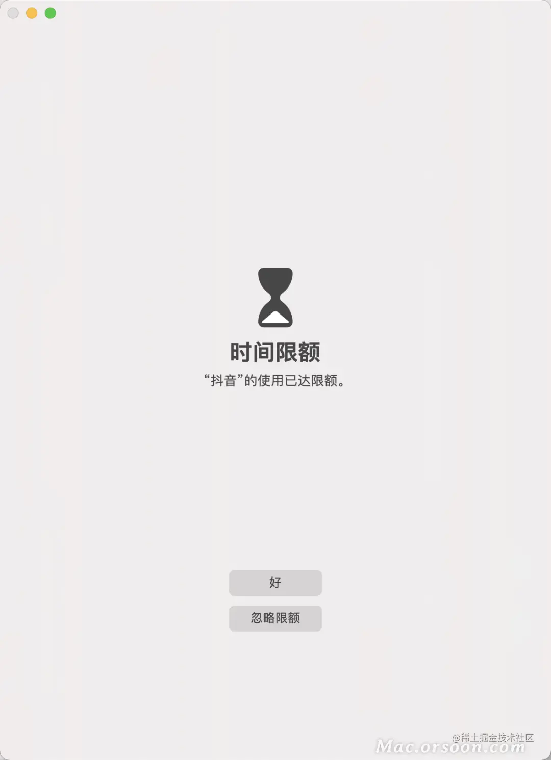 有趣的是,被限 制的应用其实还在后台运行,比如抖音在达到时间限额后还在后台播放视频,点击「好」按钮,只会把窗体最小化,并不会退出应用。