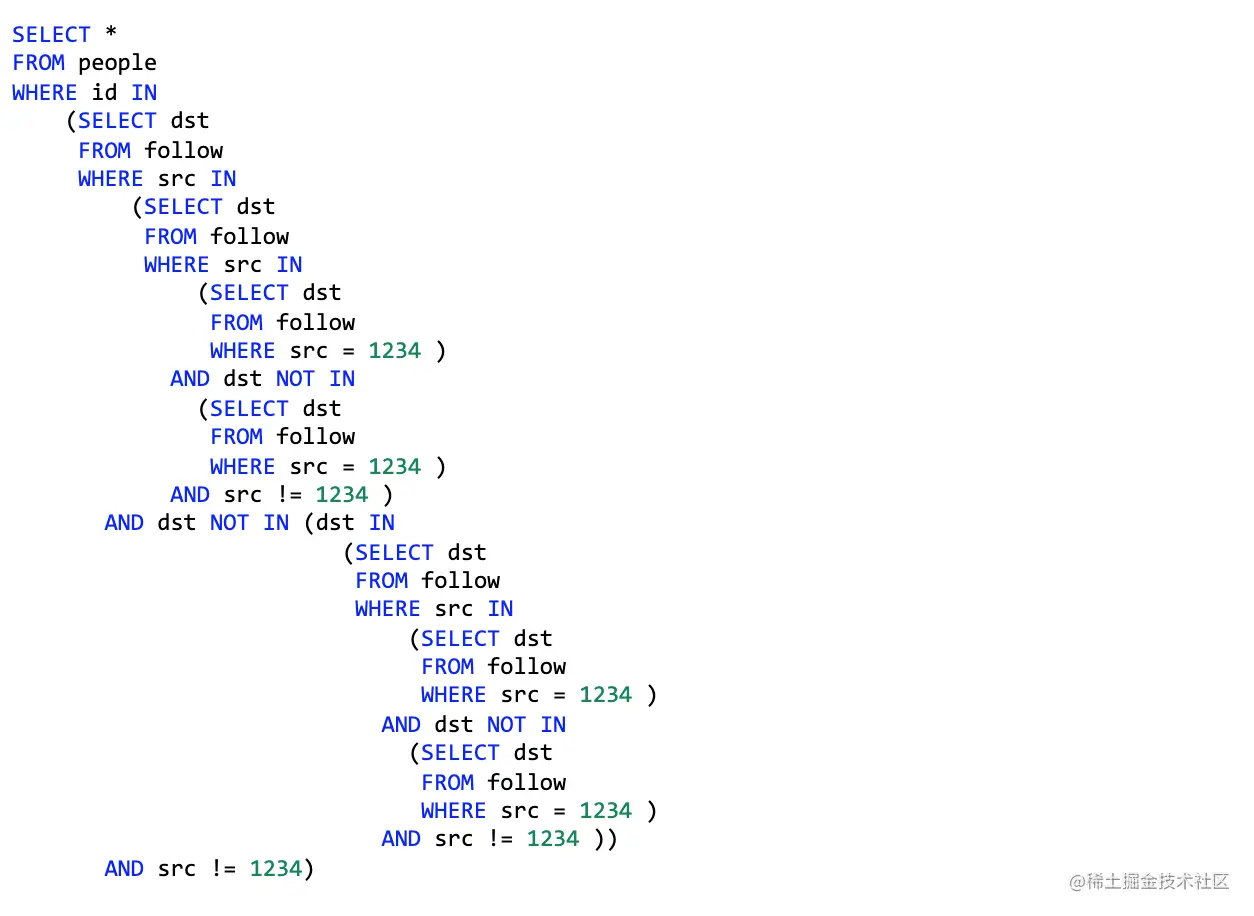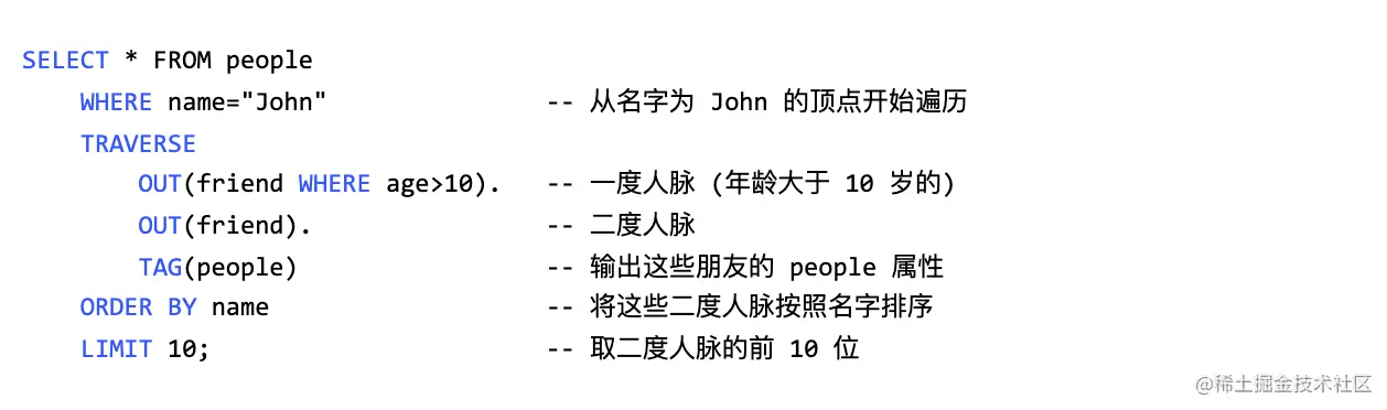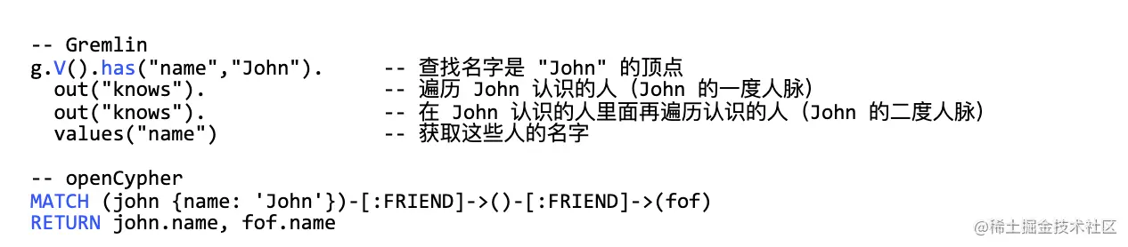 首先,要设计一套与 SQL 极具兼容性、优雅且高扩展的语法,以下是目前两个非常流行的图查询语法两度人脉的示例: