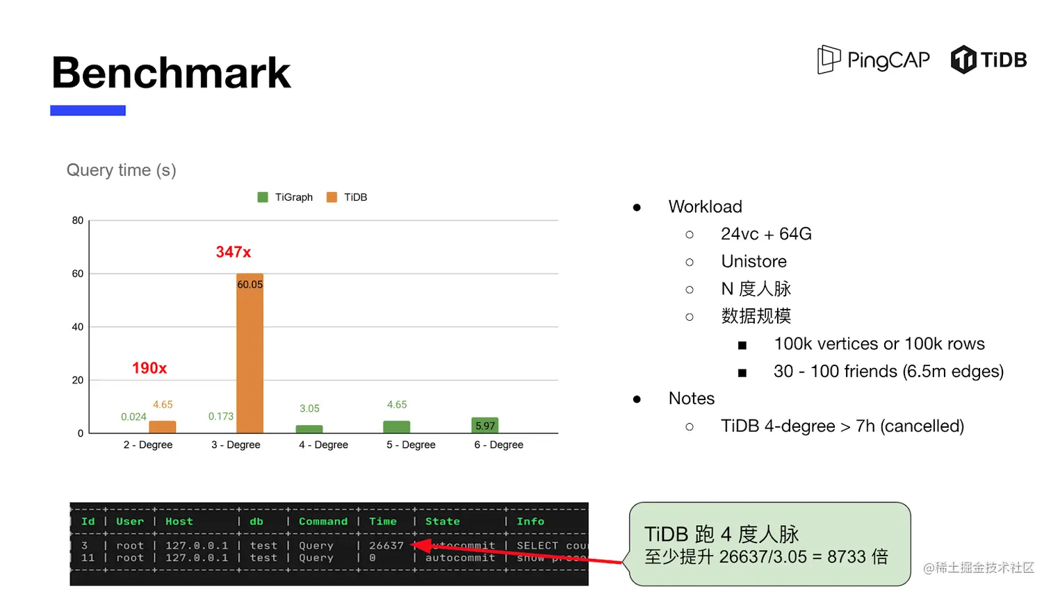 于是采用更小的数据集,在 10w 行数据 + 650w 条边的规模下,测试 N 度人脉场景下 TiDB + Unistore 与 TiGraph 的性能对比。从上图可以看到,TiGraph 可以跑完六度人脉的测试,但是 TiDB + Unistore 只能跑三度人脉,第四度人脉跑了 7 小时还没有出结果。随着人脉度的增加,TiGraph 的性能提升越明显,二度人脉的性能提升 190 倍,三度人脉的性能提升 347 倍,四度人脉在有限的时间内没有跑出最终结果,估算至少可以提升 8700 多倍。 TiGraph 后期采用 TiKV 存储后,在海量的图数据规模下也能弹性扩容,再配合 Coprocessor 实现图数据的计算下推,TiGraph 的查询性能还能再进一步提升。