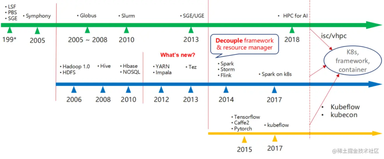 上图是我们做的一个分析,我们将其分为三层,最下面为资源管理层,中间为领域的框架,包括AI的体系、HPC、Batch, WKflow的管理以及像现在的一些微服务及流量治理等。再往上是行业以及一些行业的应用。