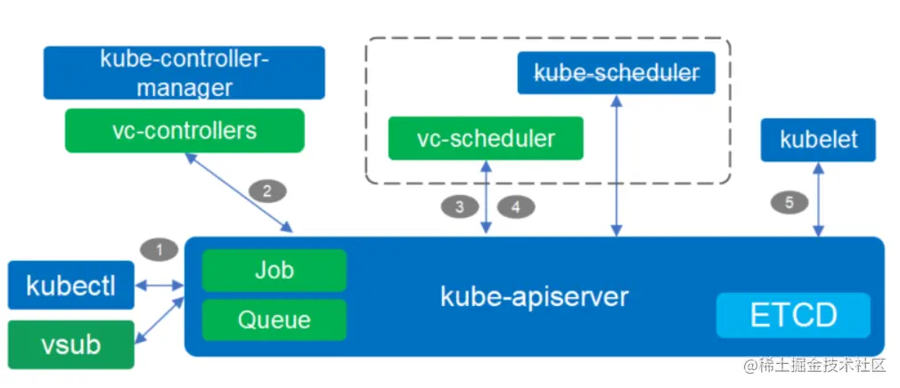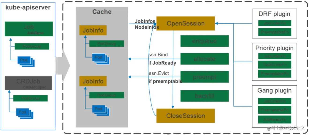 蓝色部分是 K8s本身的组件,绿色的部分是Volcano新加的一些组件。