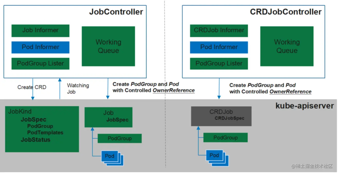 右边为CRD Job Controller,通过下面的PodGroup去做集成。