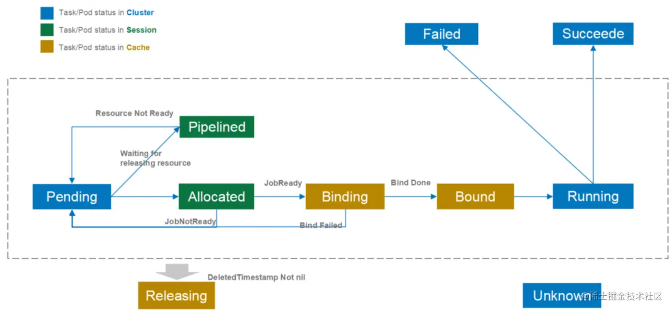 另外,我们在Pod和Pod的状态方面增加了很多状态,图中蓝色部分为K8s自带的状态;绿色部分是session级别的状态,一个调度周期,我们会创建一个session,它只在调度周期内发挥作用,一旦过了调度周期,这几个状态它是失效的;黄色部分的状态是放在Cache内的。我们加这些状态的目的是减少调度和API之间的一个交互,从而来优化调度性能。