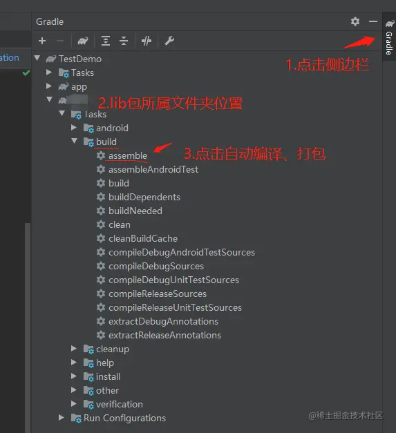 1.点击左边侧边栏gradle—>build—>assemble, 完成.so库 的打包;