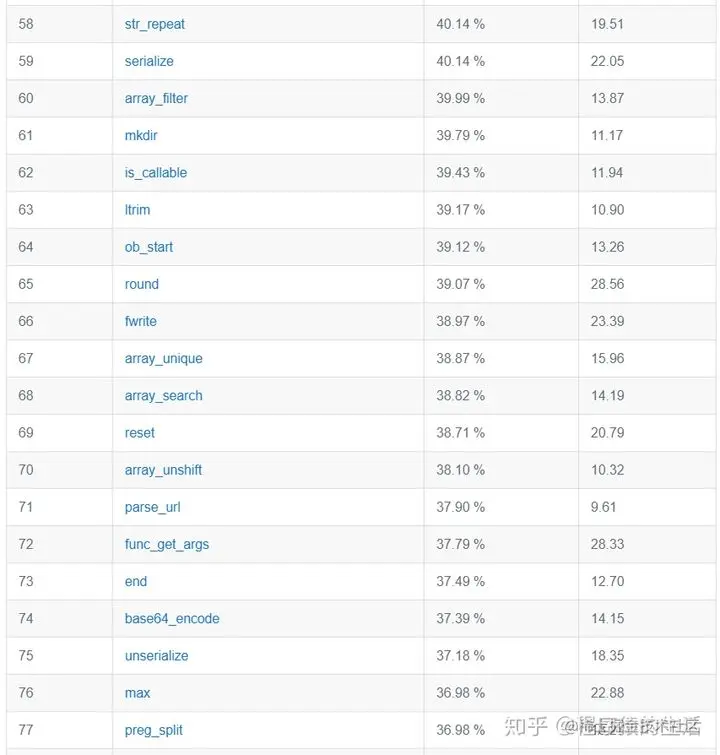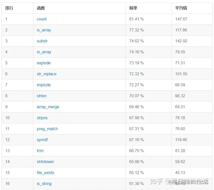 这些函数被命名使用,并从 1 到 100 进行排序。 其他的 4500 个函数现在还没在排名中。 下面频率列表表示在 PHP 代码中使用此函数的频率:参考资料来自于 1900 个 PHP 开源项目。 他们使用了 Exakat static analysis engine 静态分析引擎的 1.2.5 版本进行了审核。平均值是在一个项目中调用此函数的次数。有些函数是被封装使用的,而另一些则是主要函数。