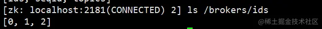 在zk的目录下,通过zookeeper的客户端查看注册brokerId,可以看到3个都注册成功
