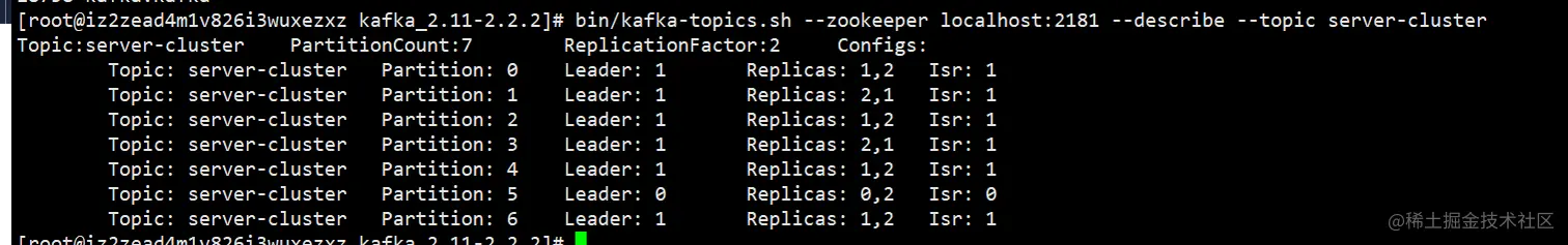 分区总数为分区数 * 副本数.接下来创建分区数为7.副本数为2的主题server-cluster.