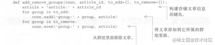 群组功能由两个部分组成,一个部分负责记录文章属于哪个群组,另一个部分负责取出群组里面的文章。为了记录各个群组都保存了哪些文章,网站需要为每个群组创建一个集合,并将所有同属一个群组的文章 ID 都记录到那个集合里面。下面的代码展示了将文章添加到群组里面的方法,以及从群组里面移除文章的方法。